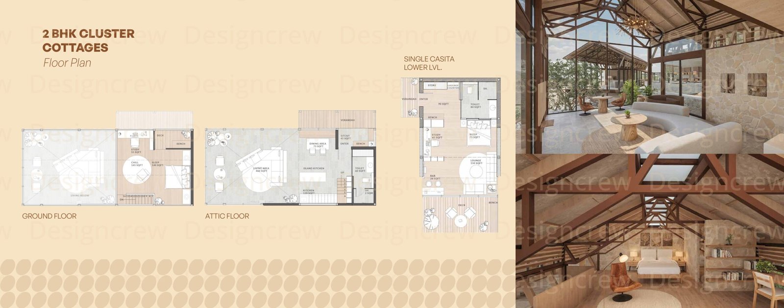 Arranged along the natural contours of the land, the 2BHK cottages form terraced clusters around landscaped olive courts. These shared patios foster a quiet sense of community, while subtle level shifts and deck separations ensure individual privacy.